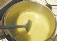 | Ajoutez l'eau ou l'infusion (ici, j'ai encore ajouté un peu de lait en poudre dans le liquide) | Brassez le mélange sans arrêt. Au début, de la mousse se forme. Elle disparaîtra bientôt, à mesure que le mélange épaissit. | Brassez jusqu'à obtenir la consistance d'une crème très épaisse. |